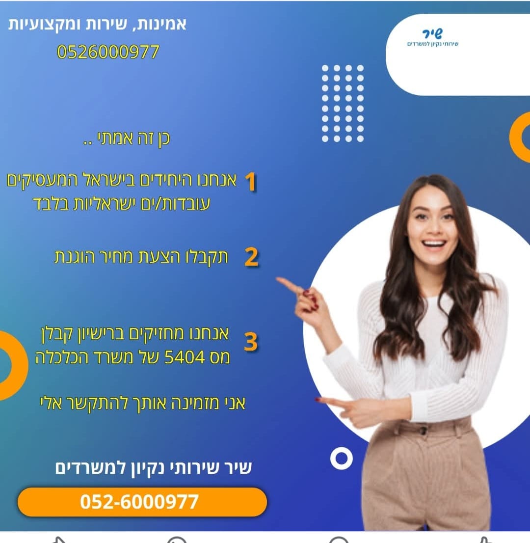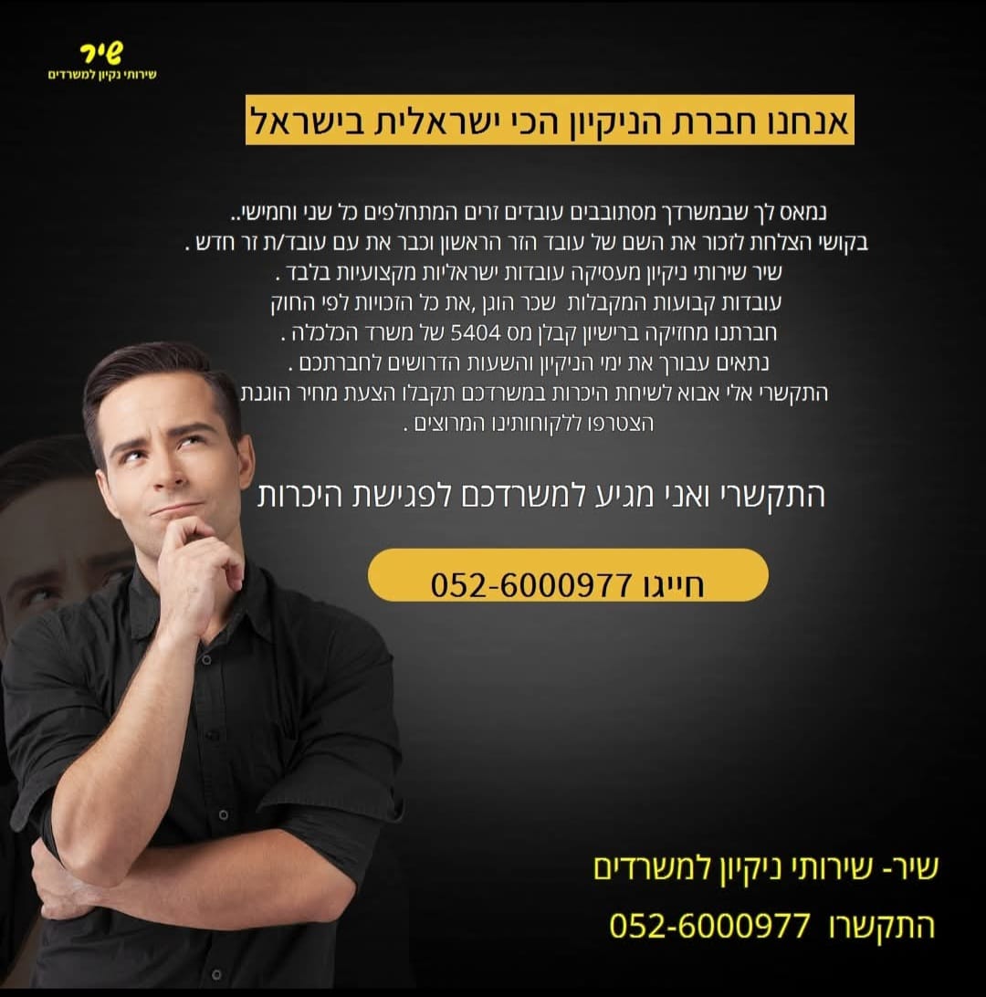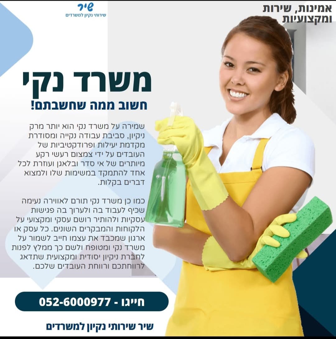 שיר שירותי ניקיון מתמחה בניקיון משרדים בלבד – עם צוות ישראלי קבוע, שירות עקבי ורישיון קבלן שירות ממשרד העבודה.
